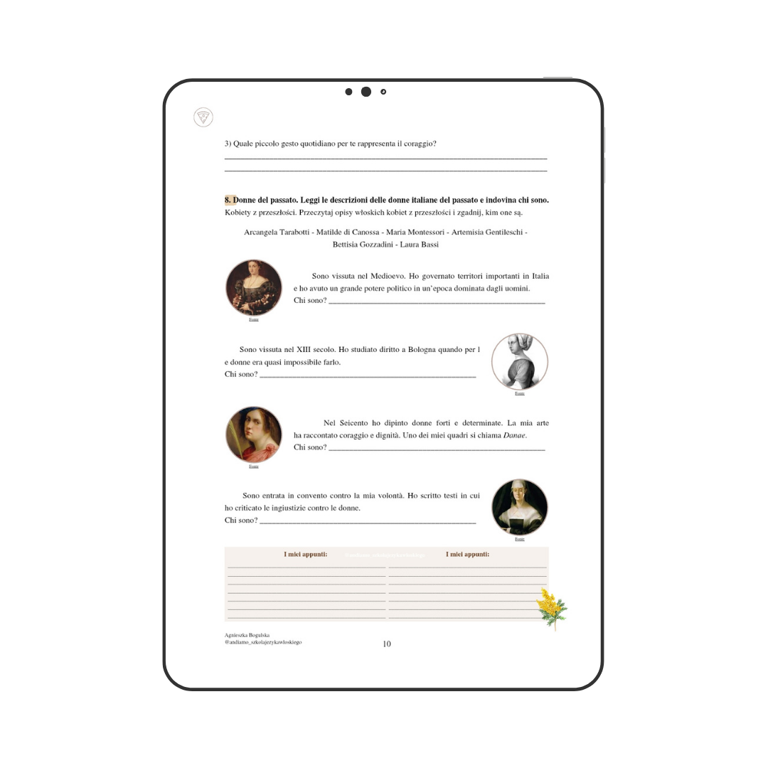To nie jest zwykły zeszyt ćwiczeń. To przestrzeń do nauki języka włoskiego w sposób spokojny, uważny i bliski prawdziwym historiom kobiet.