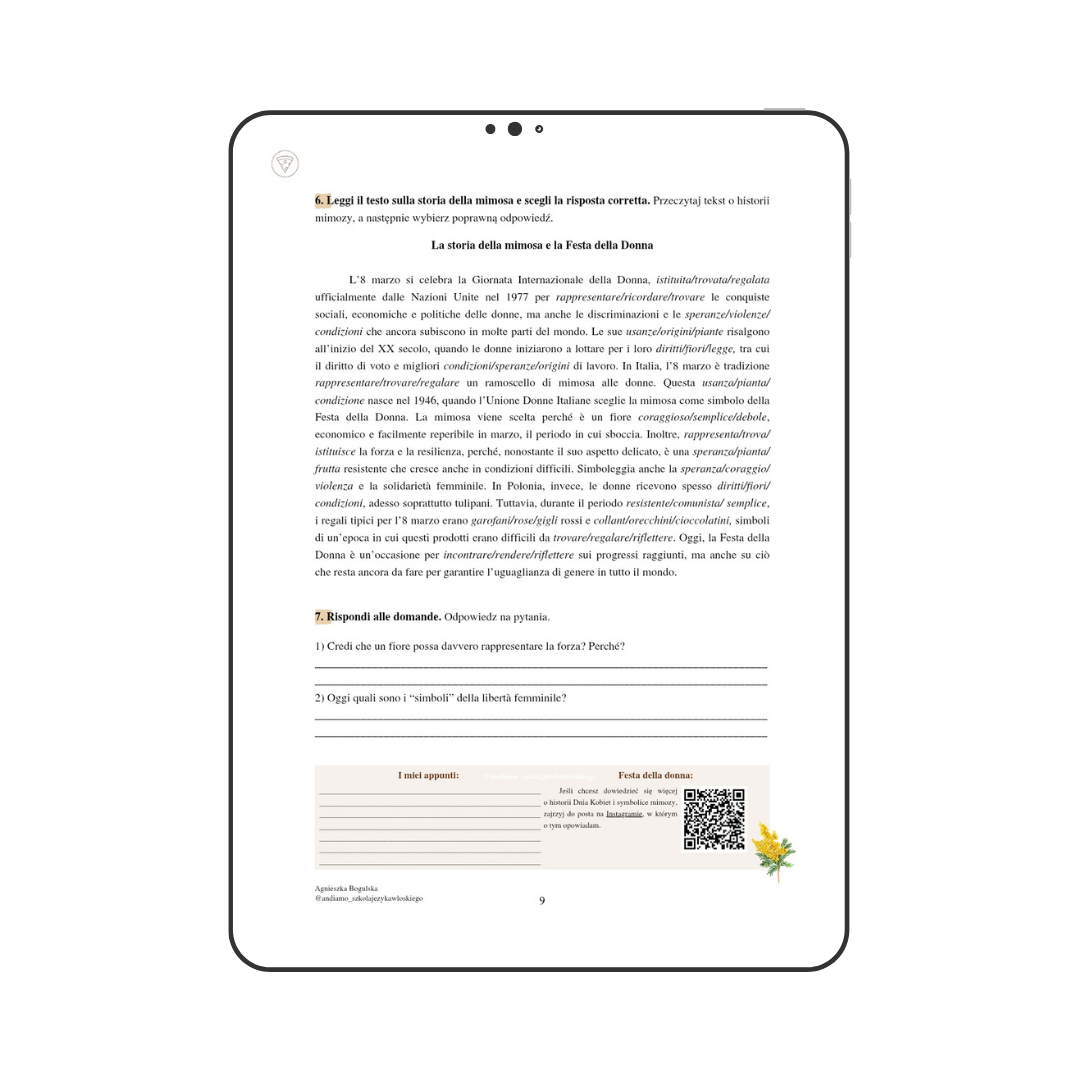 Festa della Donna. Il coraggio profuma di mimosa to spokojny, refleksyjny zeszyt ćwiczeń do nauki języka włoskiego, który łączy język z historią kobiet, symbolami i chwilą zatrzymania. Punktem wyjścia jest Dzień Kobiet i jego włoskie tradycje – mimoza, historia praw kobiet i opowieści o tych, które odważyły się iść pod prąd. Prawdziwym tematem staje się jednak coś więcej: odwaga, wolność i codzienna siła, która często rodzi się w małych gestach.To propozycja dla osób, które chcą uczyć się włoskiego w kontekście i jednocześnie pozwolić sobie na moment refleksji – bez presji, bez ocen, w swoim własnym tempie.